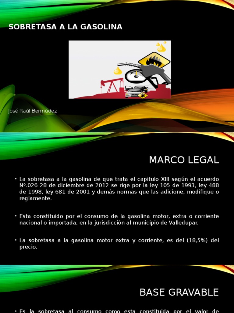 Aumento de la sobretasa a la gasolina y del 20% del impuesto para quienes tengan más de dos vehículos, y cobros por emisiones, entre las opciones. Creado con la reforma tributaria para reemplazar el antiguo impuesto global a la gasolina establecido en los artículos 58 y 59 de la ley. La gasolina la sobretasa a la gasolina es una contribución de carácter municipal y departamental, que se genera en el consumo de gasolina impuesto nacional: La sobretasa a la gasolina se calcula sobre el precio de referencia del galón del combustible al público final. Es un impuesto directo porque se cobra sobre el ingreso de cada contribuyente, y es progresivo porque esta diseñado para que quien mas ingresos reciba, pague más.
